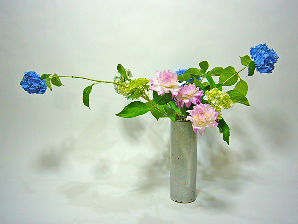 | Comment | 四方正面の投げ入れで、平真型(草月流の基本花型の一つ)をいけました。 ダリアのピンクとアジサイのブルーがとても綺麗に映えて、 嬉しくなりました。いつまでも咲いていてほしいと思います。 |