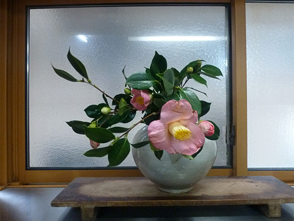 | Comment | ふっくらした器は中も外も艶やか。 大きく咲いた椿の花と色濃くやぶつばきの葉は元気そのもの。 葉を整理し、次に咲く花をも生かし、元気の出る逞しさを出しました。 |