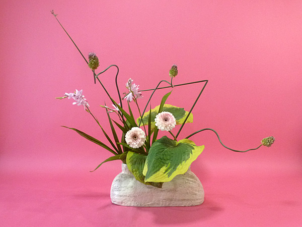 | Comment | 大きく広げた斑入りのギボウシの柔らかい色合いが瑞々しい葉の面に対し、細い茎のいろいろな表情を出して伸びるフトイやタンチョウアリアムの線の広がりを考えて使いました。 空間を取り込み優しいながらも大きな作品になりました。 |