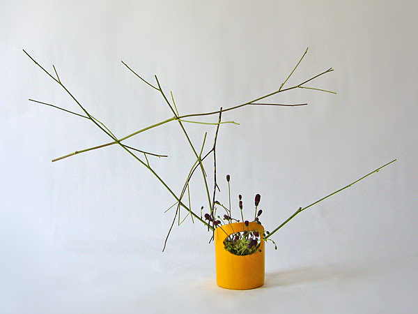 | Comment | 花器の黄色の色を中心とし、吾亦紅を穂と茎の線と、はっきり分け、いけました。 |